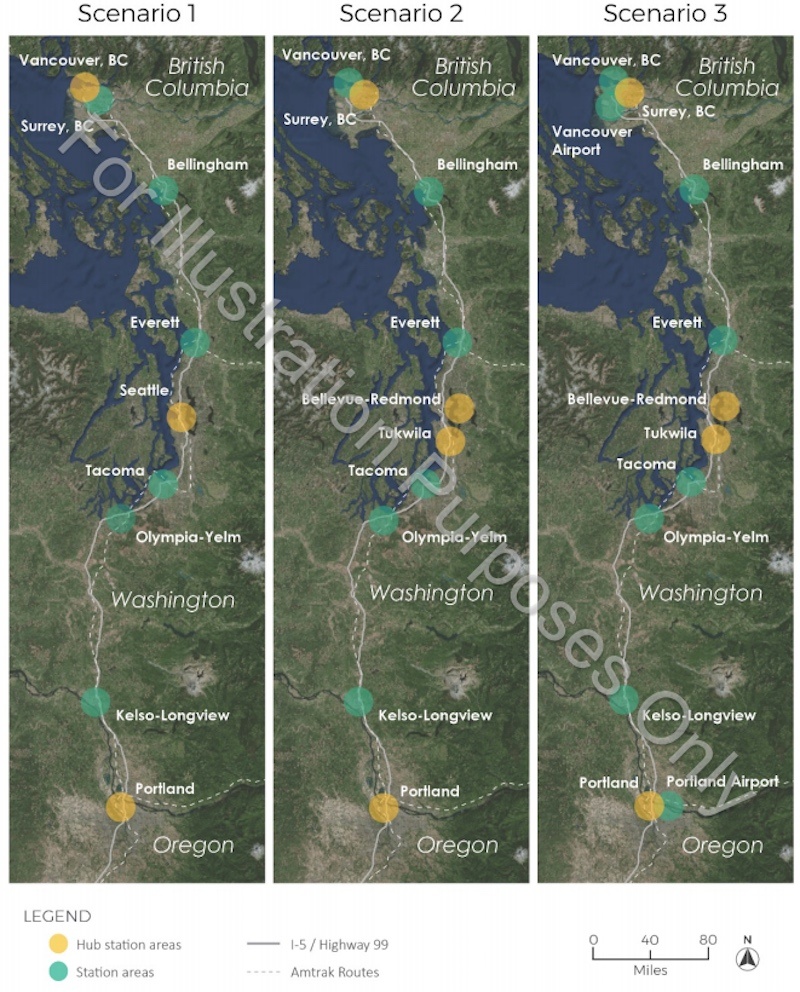 При скорости 400 км/час (250 миль в час) время в пути между Ванкувером и Сиэтлом составит около одного часа, включая возможные остановки в Беллингеме и Эверетте.